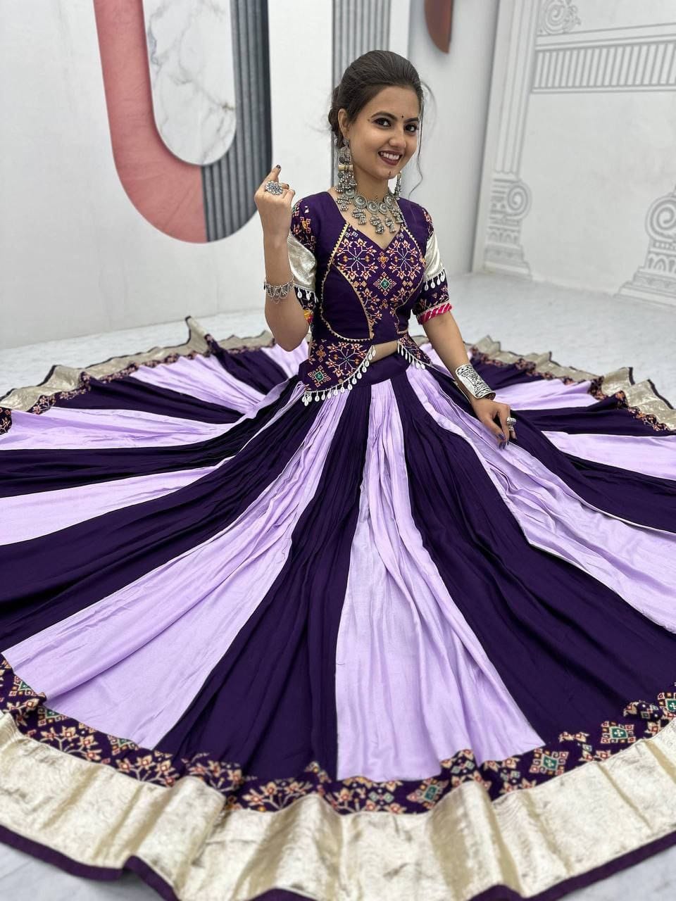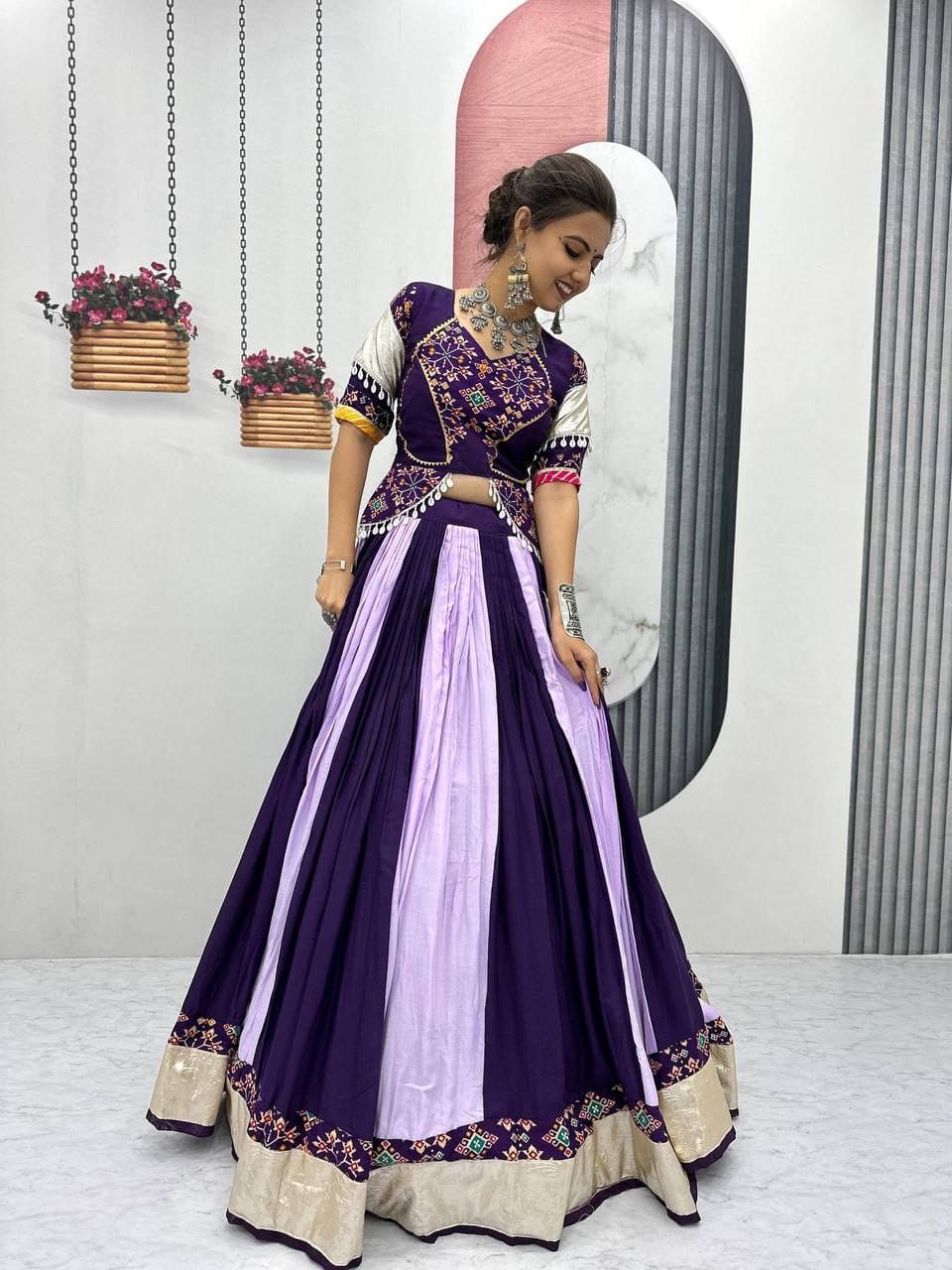 Get festive-ready with this stunning Navratri Chaniya Choli set in vibrant purple and mehndi green. Designed in pure cotton, it features a 6-meter flair lehenga with traditional lumpi lace and ribbon work. The stitched blouse with adjustable margins and a matching dupatta completes the perfect Garba night outfit.